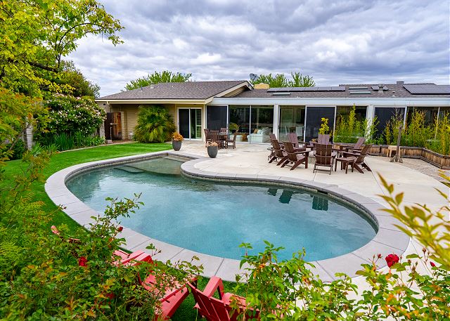 Elevate your Paso Robles experience with a stay at this stunning hilltop home nestled within an organic almond orchard, offering breathtaking views of downtown. This mid-century modern architectural gem is expertly designed with passive solar features, seamlessly blending indoor and outdoor living spaces. Floor-to-ceiling windows flood the home with natural light and allow for a seamless connection to the fresh air and outdoor amenities. Step outside to discover a wealth of outdoor living options, including spacious decks, a refreshing pool, a soothing hot tub, a BBQ area, and a cozy gas fire pit - perfect for evenings under the stars. Whether you prefer lounging by the pool or dining al fresco, you'll find a myriad of seating and dining areas to suit your mood. Indoors, the home boasts a large game room complete with a pool table and shuffleboard, ideal for friendly competitions and entertainment. **Pin Ball machines are not in working order and not for guest use.**